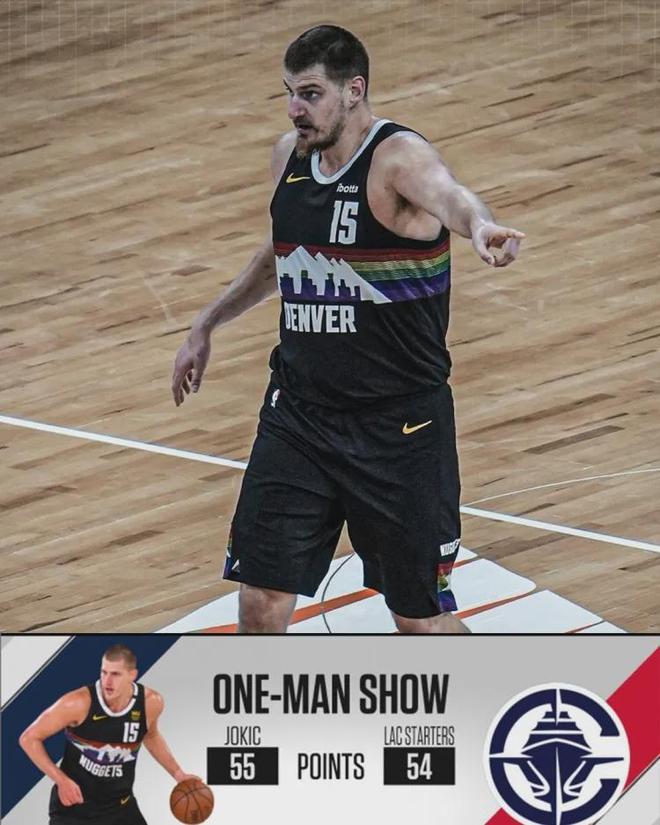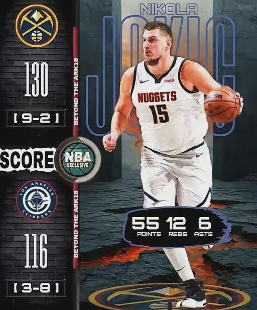 乖乖,约基奇投篮23中18,以高达约78%投篮命中率狂轰55分12板6助,带领掘金130-116取胜,对面的快船首发五虎加起来才54分。